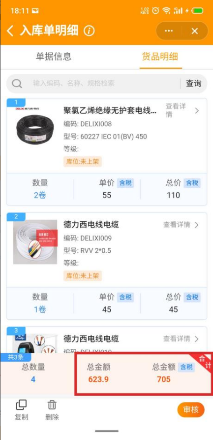 ⑩在“入库单明细”中,进入“货品明细”页面查看,可查看“总金额”和“含税总金额”。