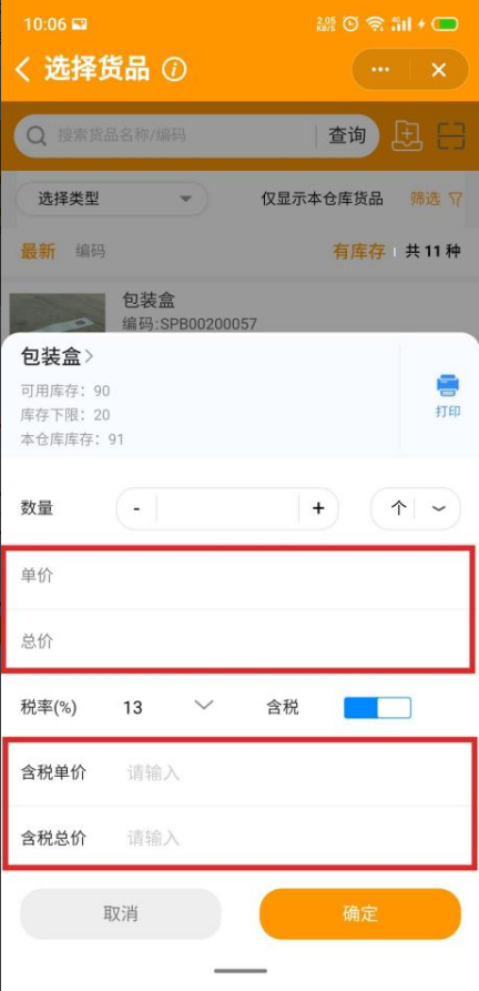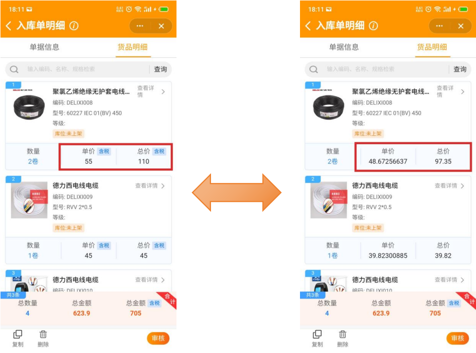 ⑪点击单个货品“单价”和“总价”,可切换展示“含税”和“不含税”的单价和总价。