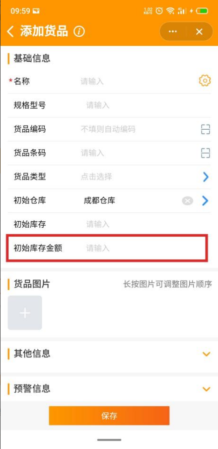 (2)添加货品,“初始库存金额”为“不含税”金额。