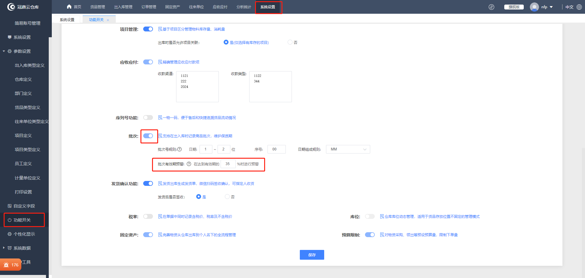 在【系统设置-功能开关-高级功能】中找到批次功能,点击开关启用,并在下方的“批次有效期预警”中设置达到有效期天数的百分之多少时进行预警。
