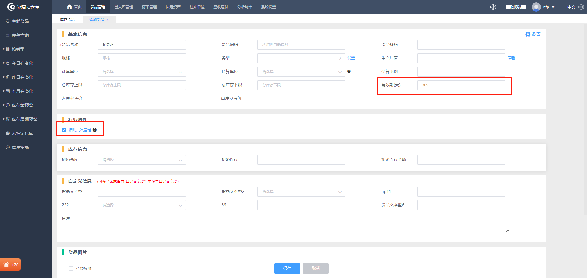 在添加、修改货品时对需要按批次管理的货品启用批次管理,并设置好有效期天数。