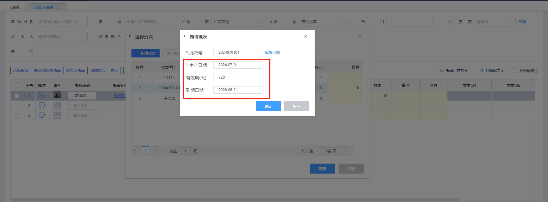 3.入库时设置入库批次的生产日期,根据有效期天数自动计算出该批次的到期日期