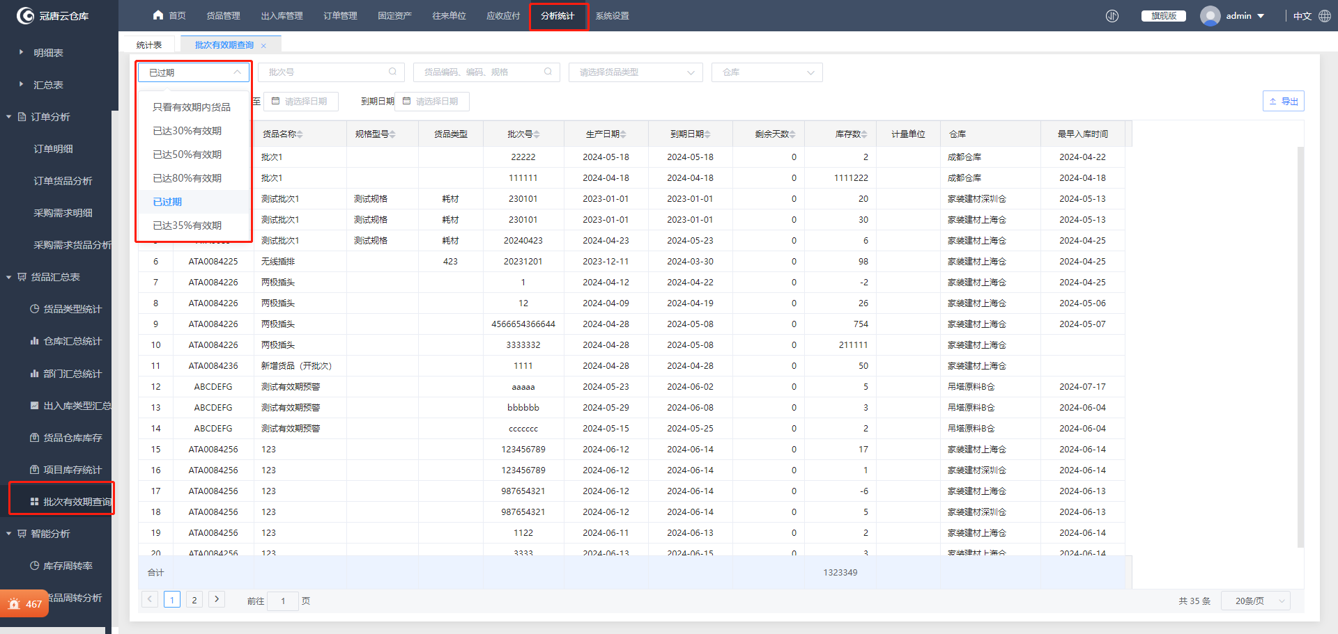 在电脑端的【分析统计-批次有效期查询】中可以查看并导出已过期及各个预警级别的货品批次信息。