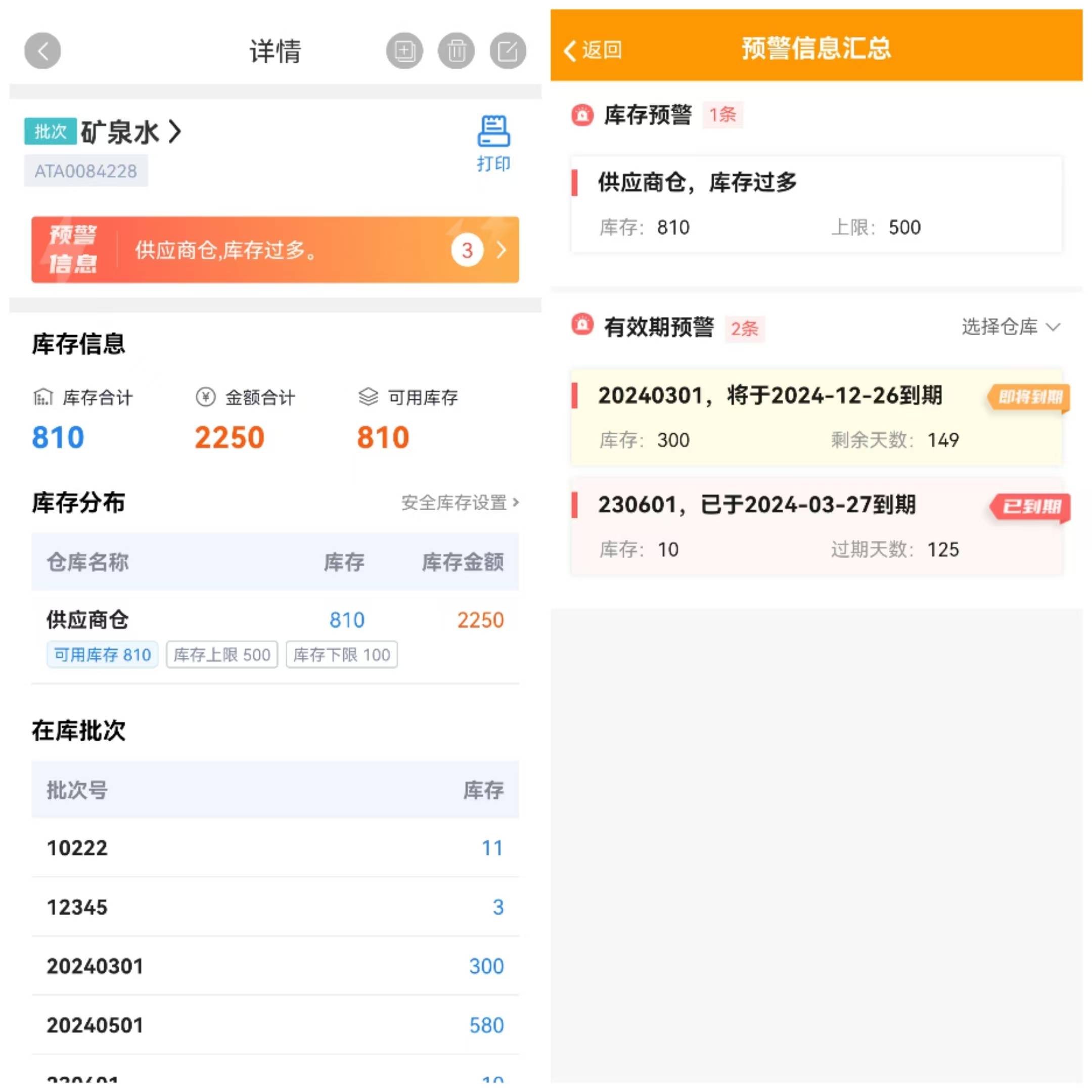 在手机端的各个货品详情中可以查看【预警信息】,展示了已过期以及达到自定义预警线的批次信息。