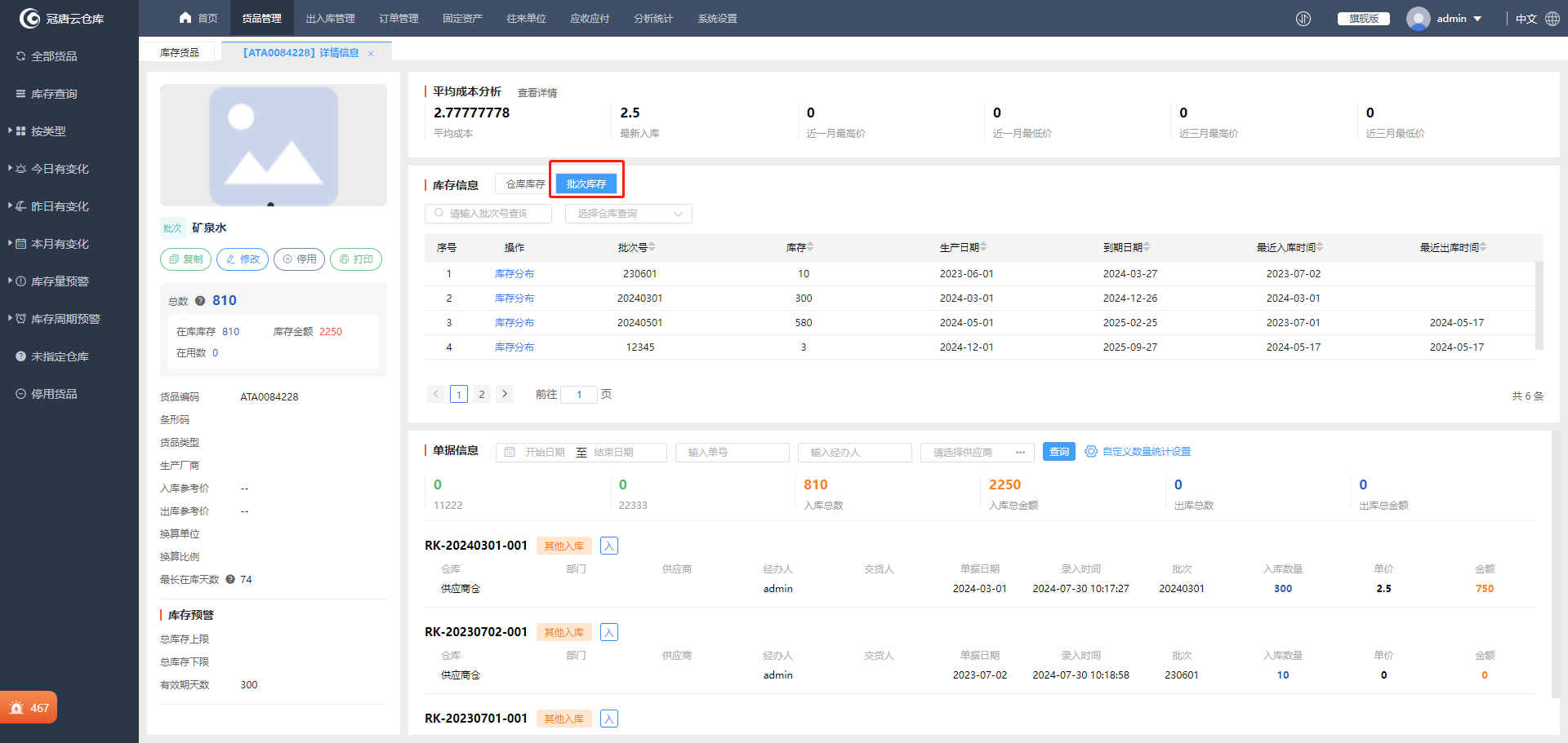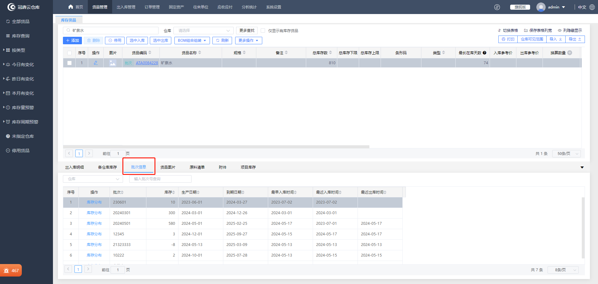 启用批次管理的货品不仅保质期管理非常重要,对各个批次的库存情况也需要随时掌握了解。冠唐云仓库的电脑端和手机端均支持查看货品各个批次的库存。