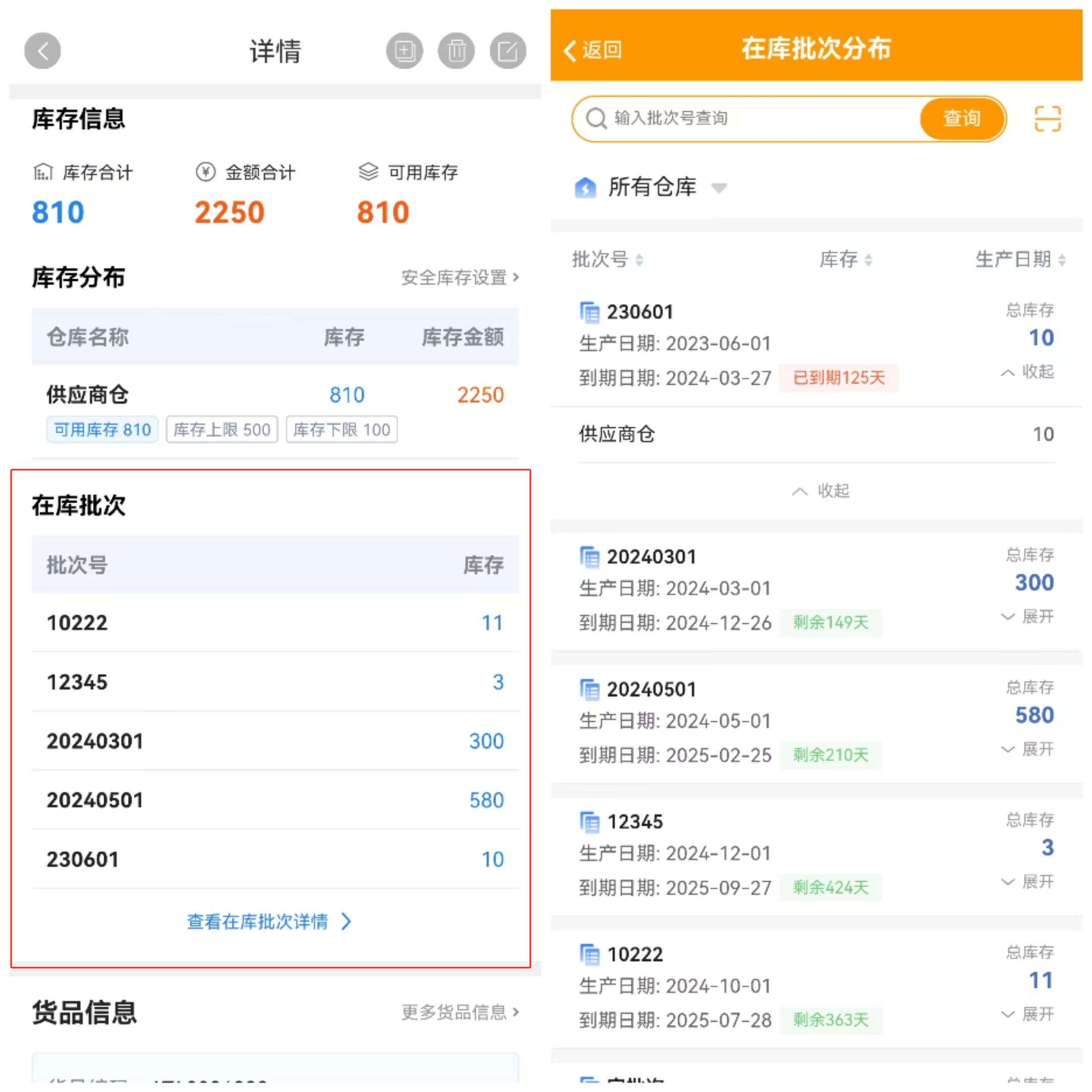手机端进入各个货品的详情页,在库存信息模块可以看到部分在库批次库存,点击【查看在库批次详情】,可以看到这个货品在各仓库的批次库存情况。