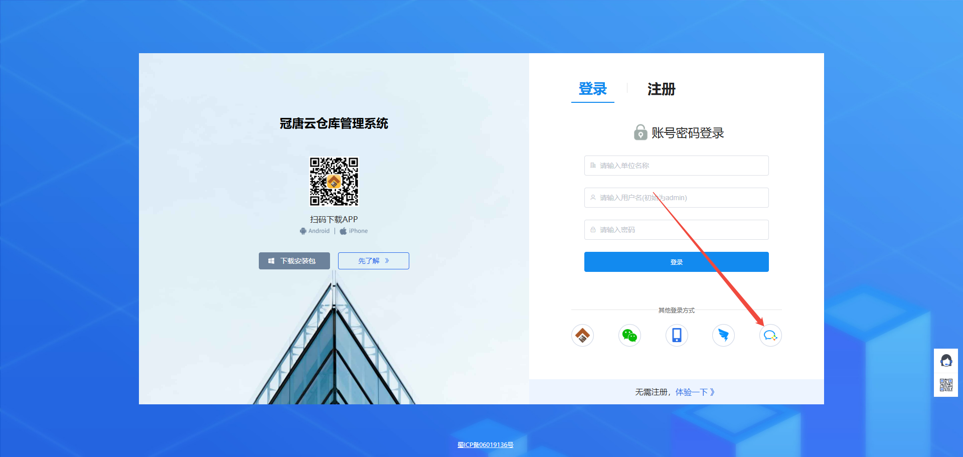 如果不想在企业微信中直接打开冠唐云仓库使用,或者电脑上没有登录企业微信,或者需要登录另外一个企业微信号的冠唐云仓库账号,可以直接在网页端登录使用,以下是详细的操作步骤