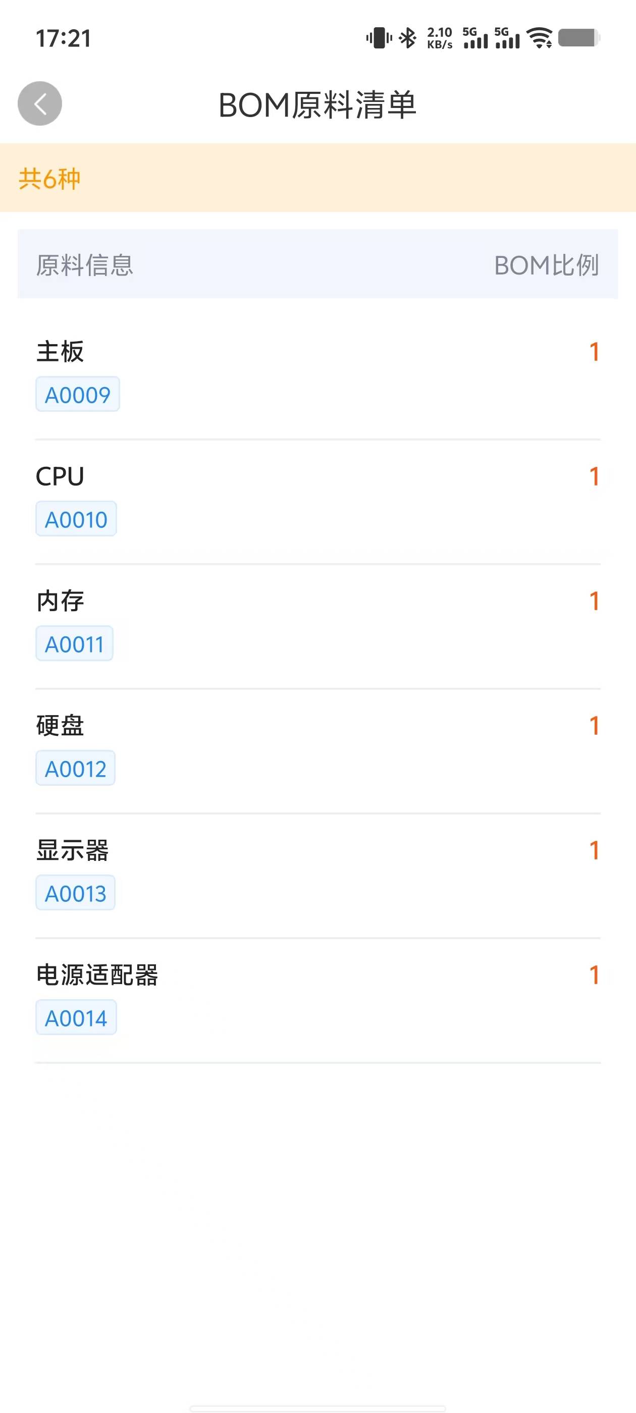 即可看到这个货品(示例中是“电脑”)的原料清单了,包括原料种数、原料的货品编码和名称、BOM组成比例