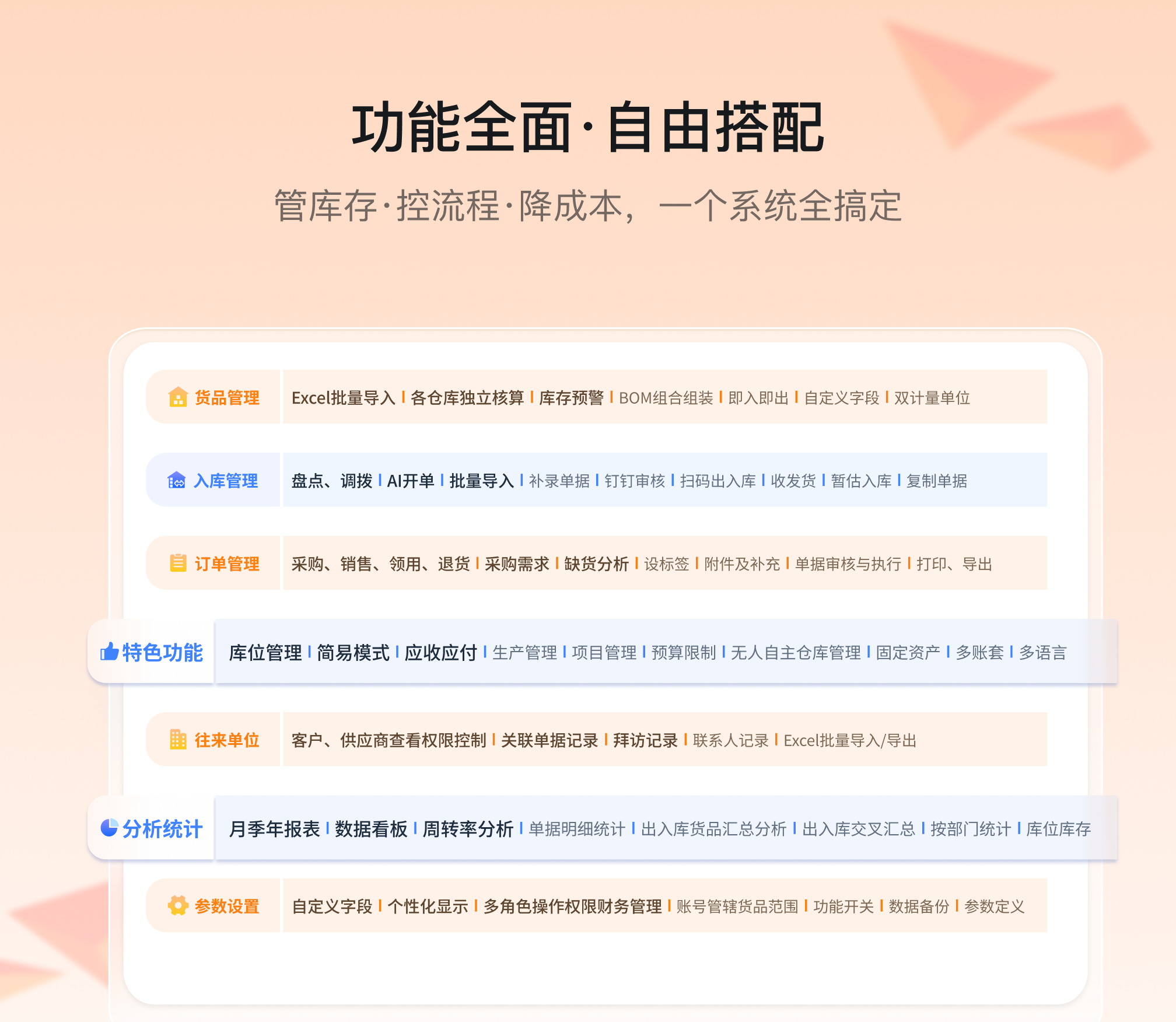 | 信息录入 | 电脑端: 【货品管理】、【往来单位管理】(支持批量导入) 手机端:【首页】-新增货品、客户管理等,【货品】等 |
