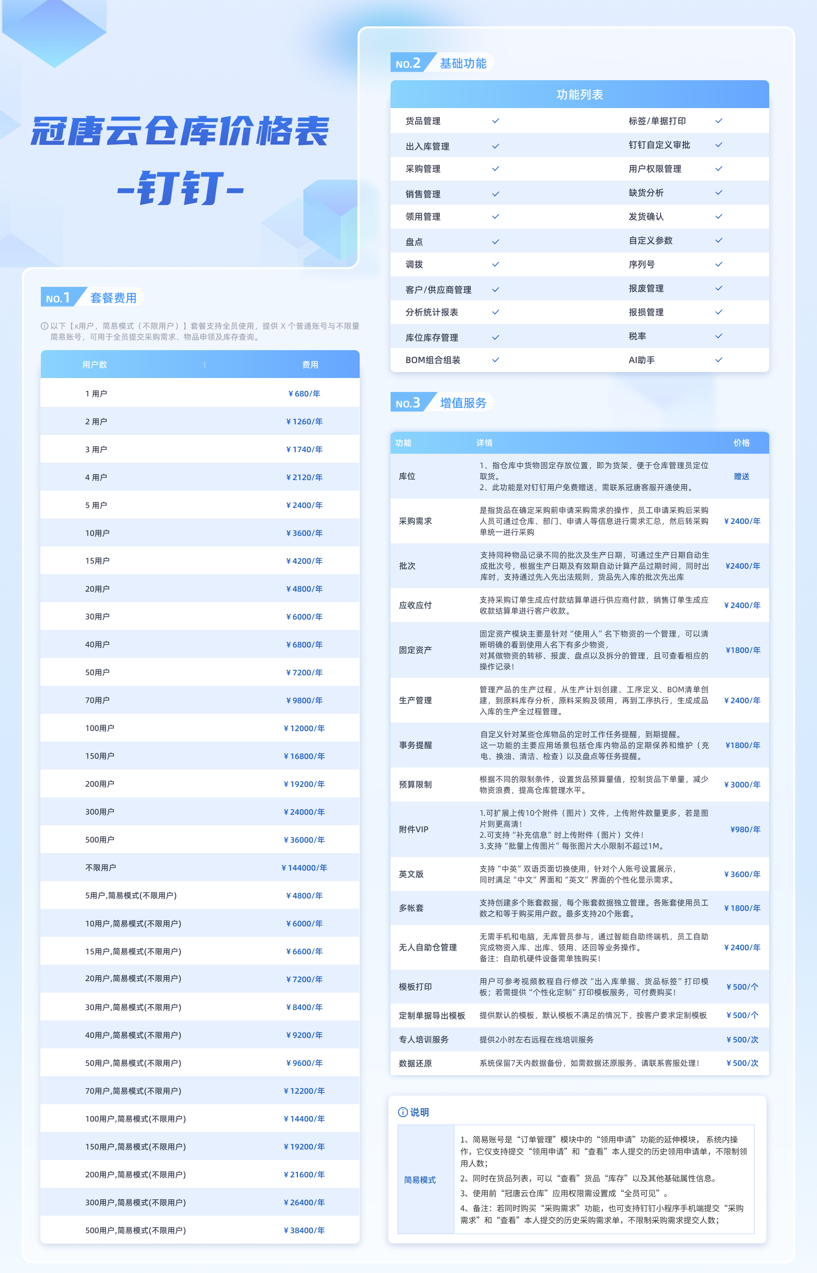 以下是冠唐云仓库钉钉版的收费标准,如有疑问或需求请拨打官方热线400-0280130或咨询客服:
