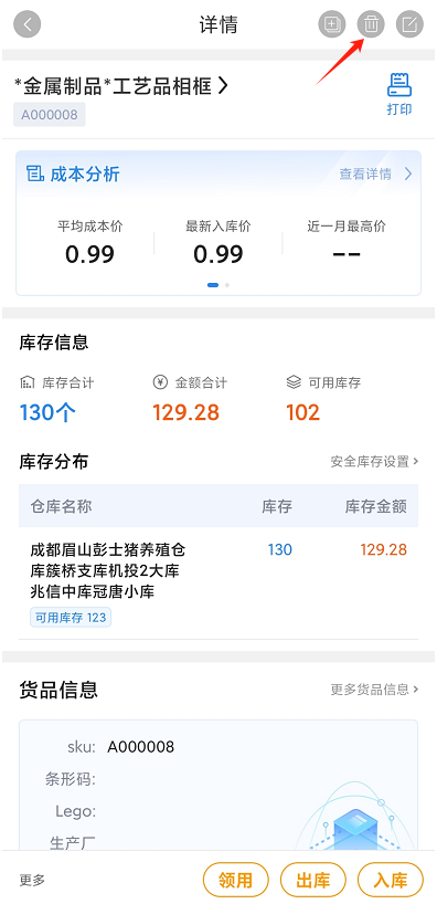APP端:点击右上角删除按钮,APP端删除只能停用货品,并不能彻底删除货品。